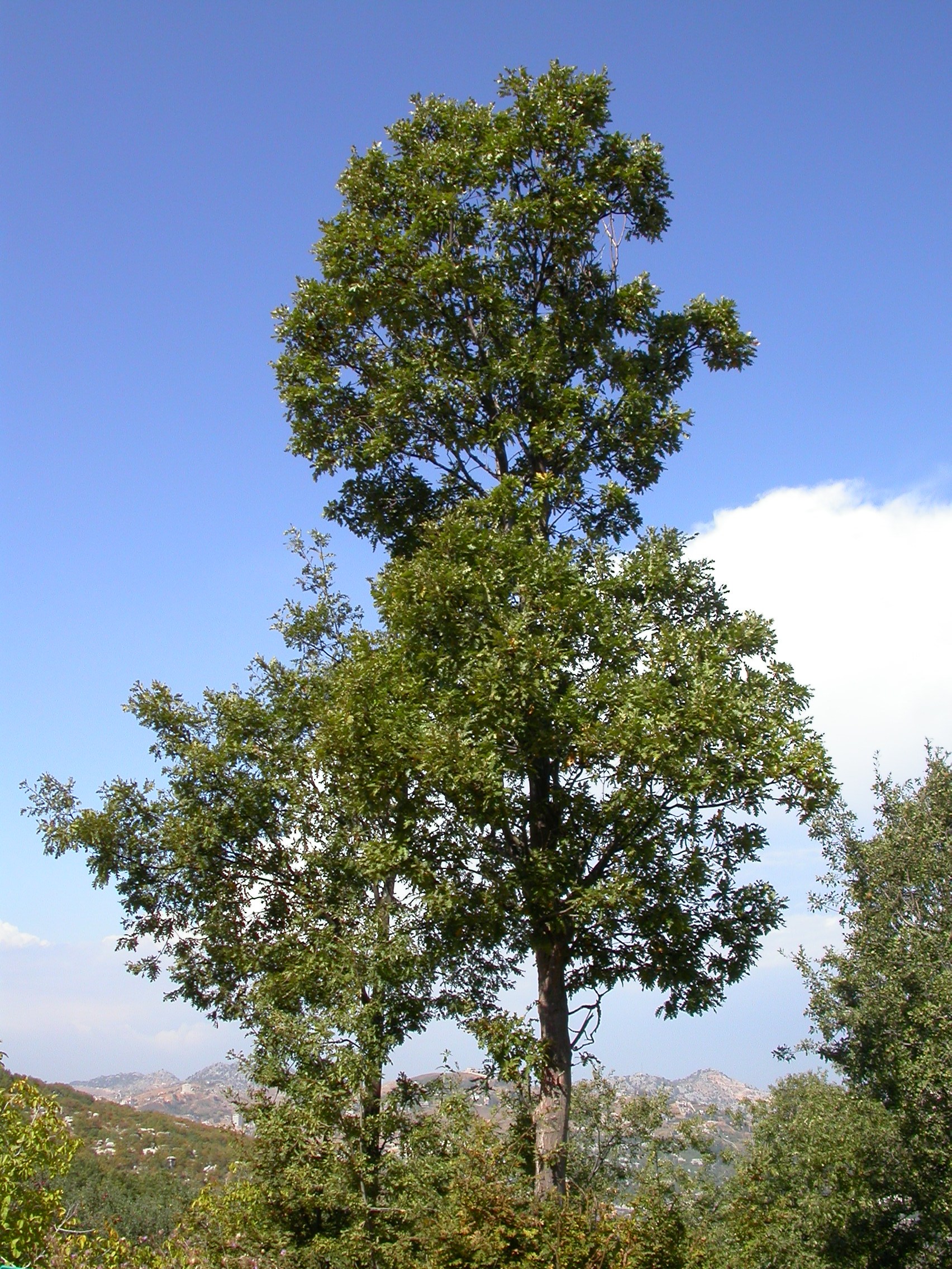 The Turkey Oak is the largest native Oak species in Lebanon. The tree reaches 30 meters in height, and its Arabic name, Al Ezr (reportedly derived from Aramaic), means pillar (in reference to the impressive trunk of the tree). The Turkey Oak is deciduous. The tree is fast-growing and has a somewhat rounded canopy. Turkey Oak trees do not bear acorns on a regular basis, and the acorns they do bear remain viable for only one month
